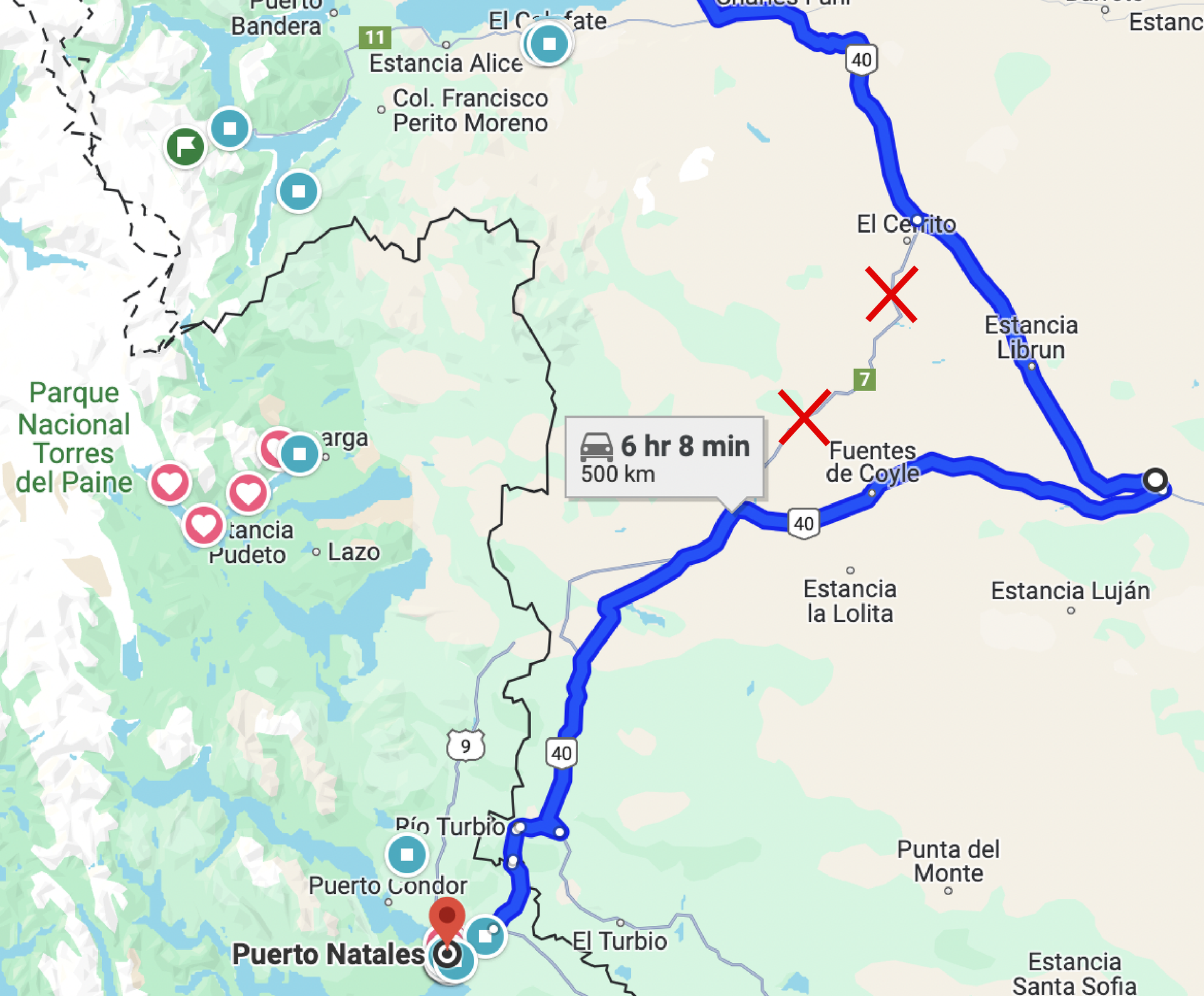 One important tip when you are driving through Argentina is to avoid the Route between Estancia Tapi Aike and El Cerrito. Your map may try to take you this way, but you should avoid this long section of unpaved road due to its remote nature and the strong possibility of a flat tire or other car trouble. Instead, drive to Esperanza and then turn left to continue Northwest to El Chalten. It looks longer, but you’ll be driving faster so it will probably take the same or less amount of time.